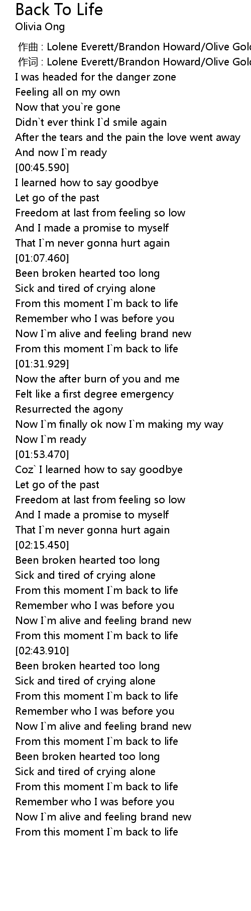 | [02:31.609] | Now I`m alive and feeling brand new |