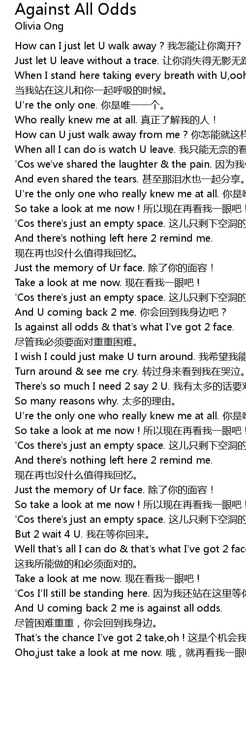| And U coming back 2 me is against all odds. 尽管困难重重,你会回到我身边。 | |