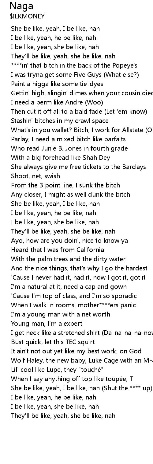 | [01:30.914] | She be like, yeah, I be like, nah (Shut the **** up) |