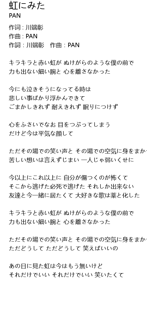 | キラキラと赤い虹が ぬけがらのような僕の前で 力も出ない細い腕と 心を離さなかった | |