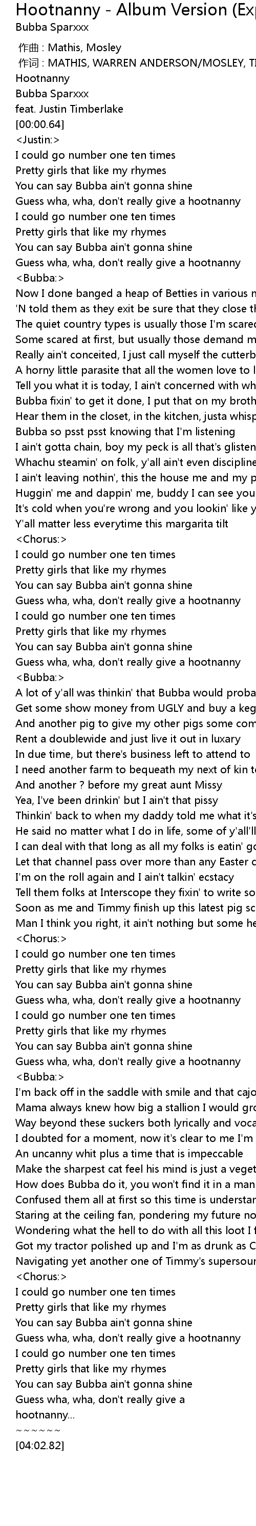 | [02:32.24] | Guess wha, wha, don't really give a hootnanny |