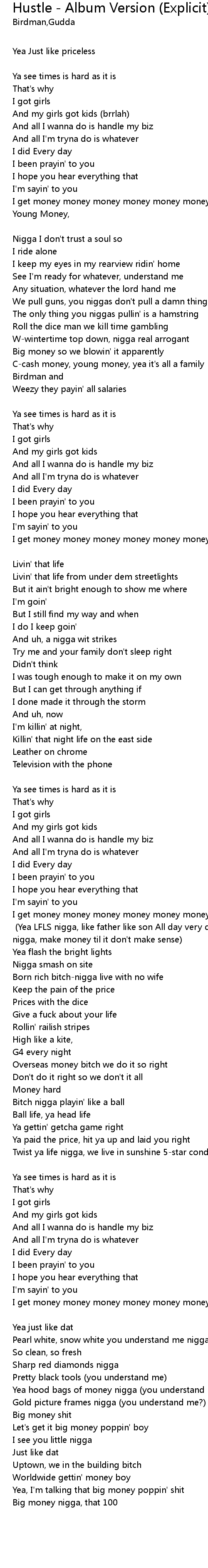 | I get money money money money money money money money money money money money [Verse 3 - Birdman:] (Yea LFLS nigga, like father like son All day very day nigga, make money til it don't make sense) | |