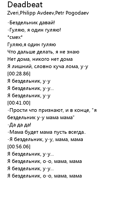 | [00:41.18] | -Прости что признают, и в конце, "я бездельник у-у мама мама" |