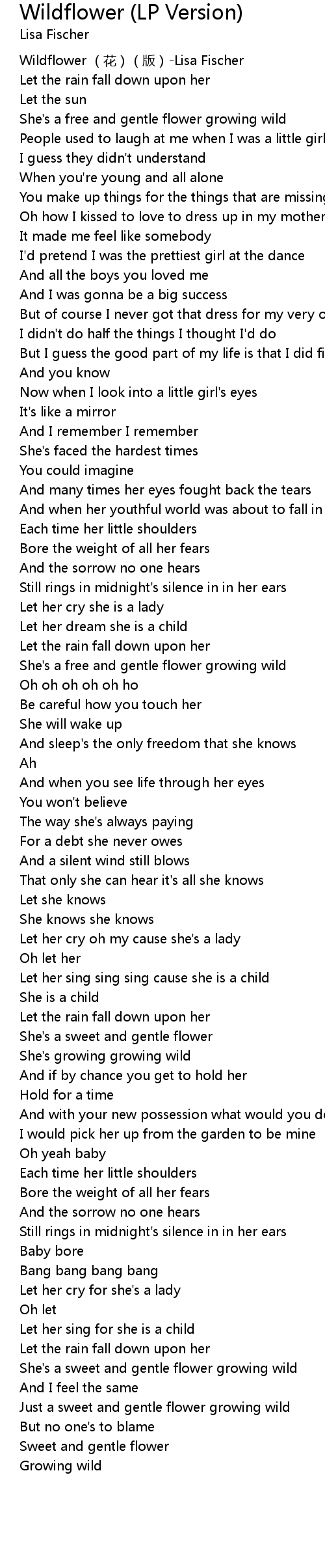 | [00:00.00] | Wildflower huā bǎn Lisa Fischer |