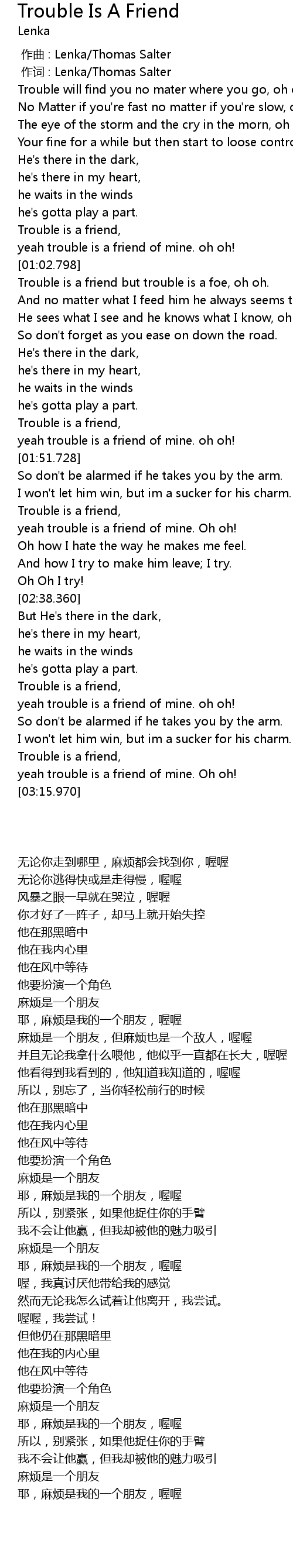 | [02:47.300] | Trouble is a friend, |