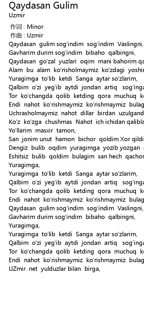 | [00:04.154] | Qaydasan gulim sog' indim sog' indim Vaslingni, |