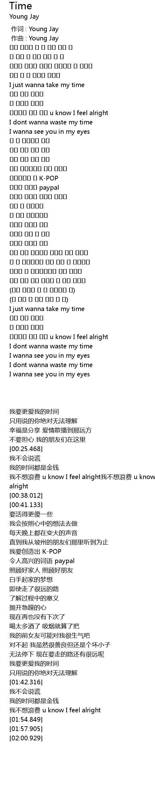 | [00:34.572] | 낭비하고 싶지 않아 u know I feel alright |