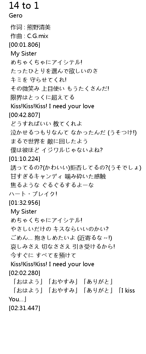 | [02:17.712] | 「おはよう」「おやすみ」「ありがと」「I kiss You…」 |