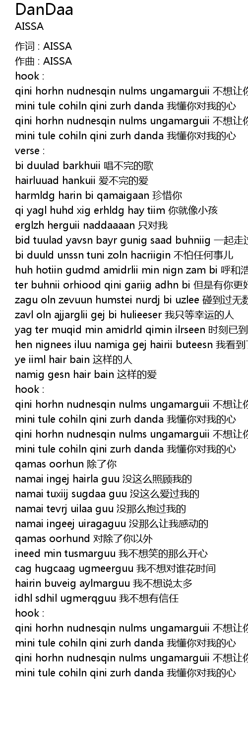 | mini tule cohiln qini zurh danda 我懂你对我的心 | |