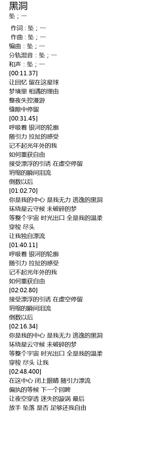 | [02:17.370] | 你是我的中心 是我无力 逃逸的黑洞 |
