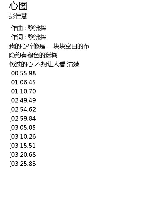 | [00:32.52] | wǒ de xīn suì xiàng shì yí kuài kuài kòng bái de bù |