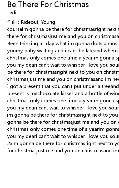 | I got a present that you can' t put under a treeand little does he know that present is mechocolate kisses and a bottle of winecause that man i got is mine all mine hook christmas only comes one time a yearim gonna spend that time with you my deari cant wait to whisper i love you sounderneath the mistletoe course im gonna be there for christmasright next to you on christmasim gonna be there for christmasjust me and you on christmasand im never gonna let you go hook christmas only comes one time of a yearim gonna spend that time with you my deari can' t wait to whisper i love you sounderneath the mistletoecourse 2xim gonna be there for christmasright next to you on christmasim gonna be there for christmasjust me and you on christmasand im never gonna let you go 3xoooo |