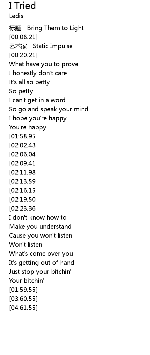 | [01:21.79][02:23.36][03:45.57] | Remember I tried |