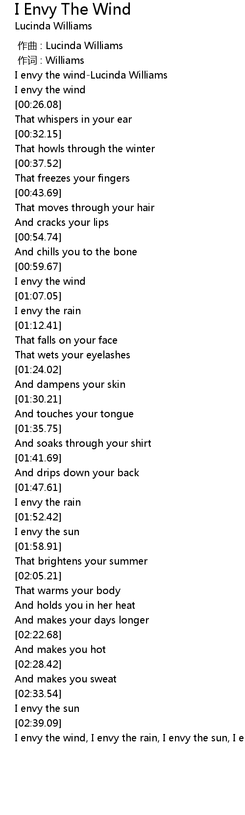 | [00:01.62] | I envy the windLucinda Williams |