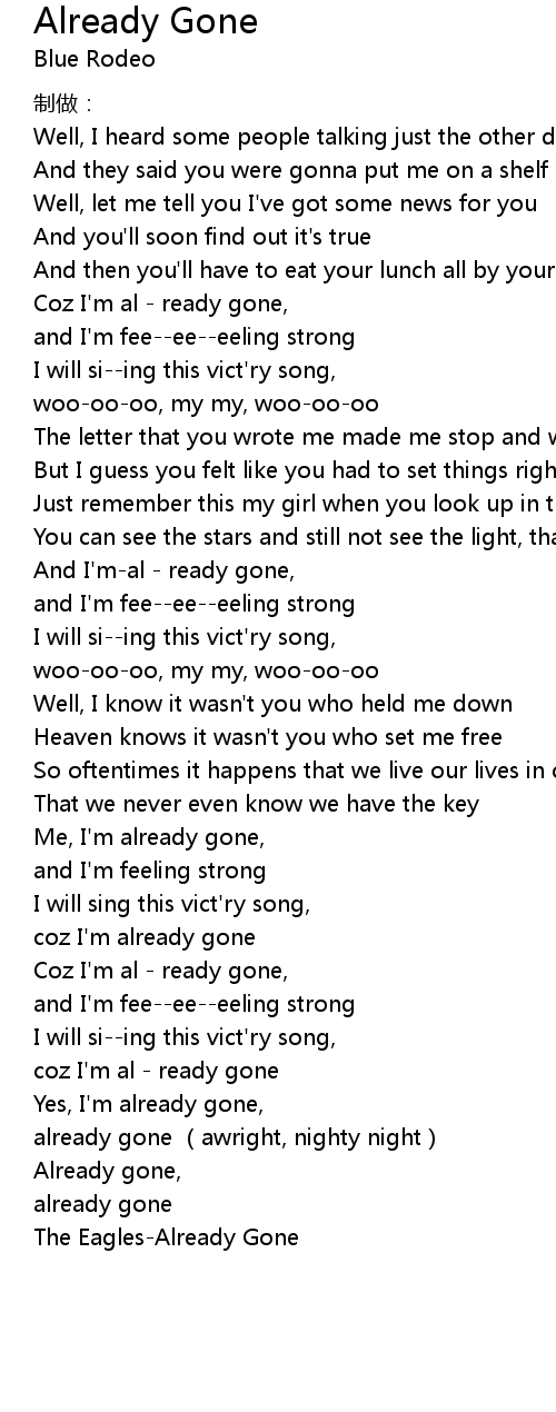 | [00:40.77] | Coz I' m al ready gone, |