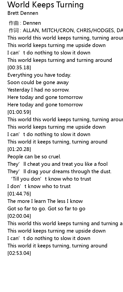 | [02:33.77] | This world it keeps turning, turning around |