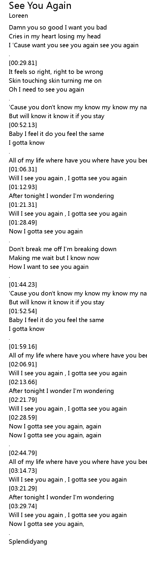 | [00:22.45] | I 'Cause want you see you again see you again |