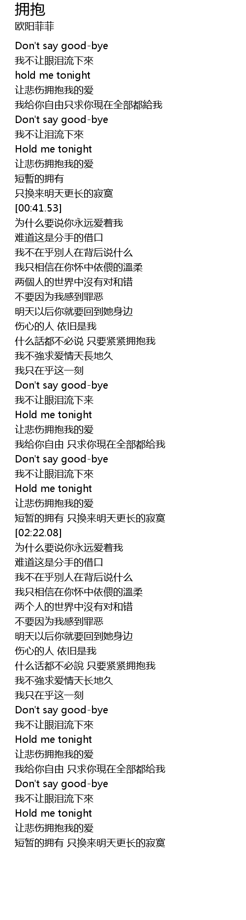 | [03:05.37] | 什么话都不必說 只要紧紧拥抱我 |