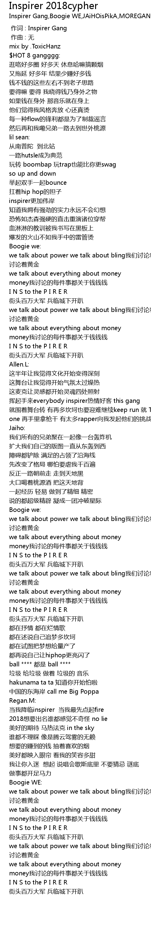 | [01:58.926] | 挥起手来everybody inspirer热情好客 this gang 就围着舞台转 有再多坎坷也要迎难继续keep run 就 To be number one 再手里拿枪干 有太多rapper向我发起他们的挑战 |