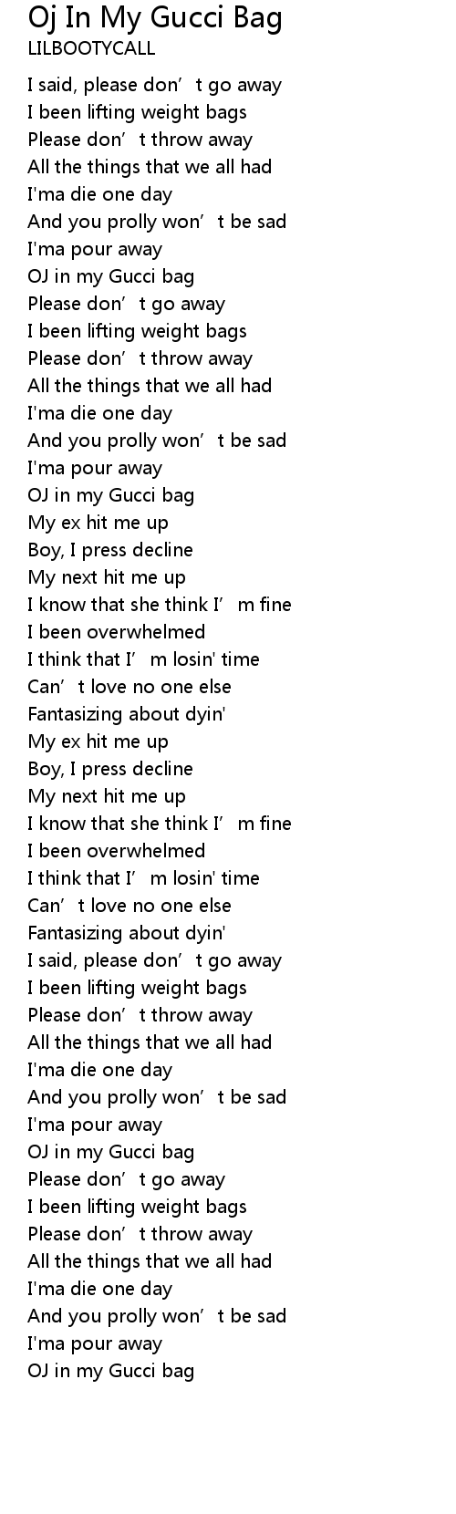 | [01:22.92] | OJ in my Gucci bag |