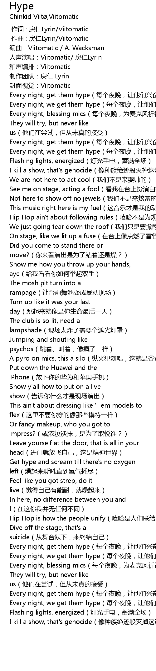 | [01:15.448] | Get hype and scream till there' s no oxygen left zào qǐ lái sī hǒu zhí dào yǎng qì hào jìn |