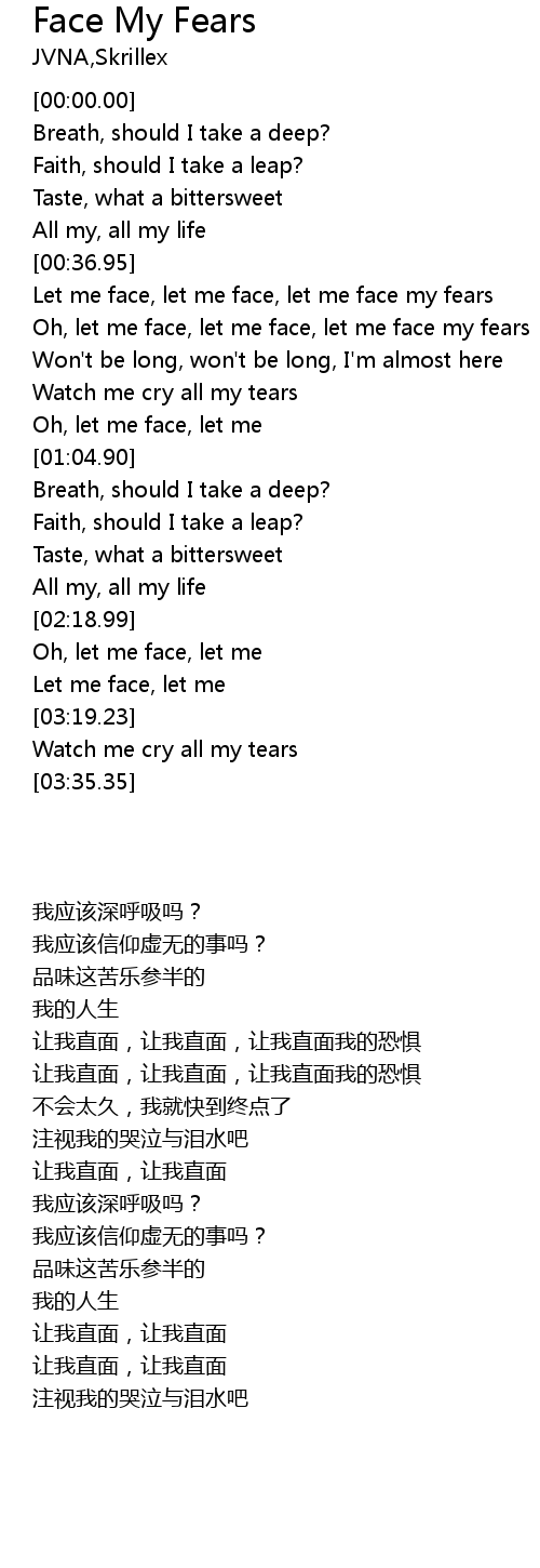 | [00:43.75] | Oh, let me face, let me face, let me face my fears |