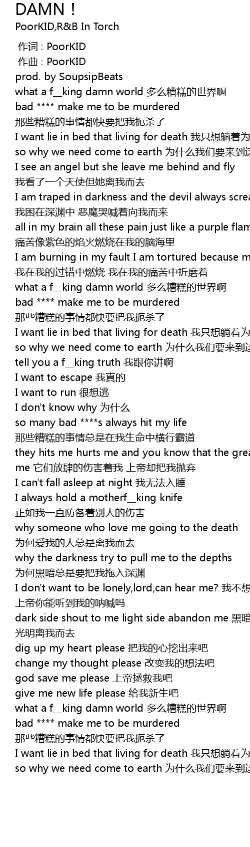 | [01:00.308] | what a f__king damn world duō me zāo gāo de shì jiè a |