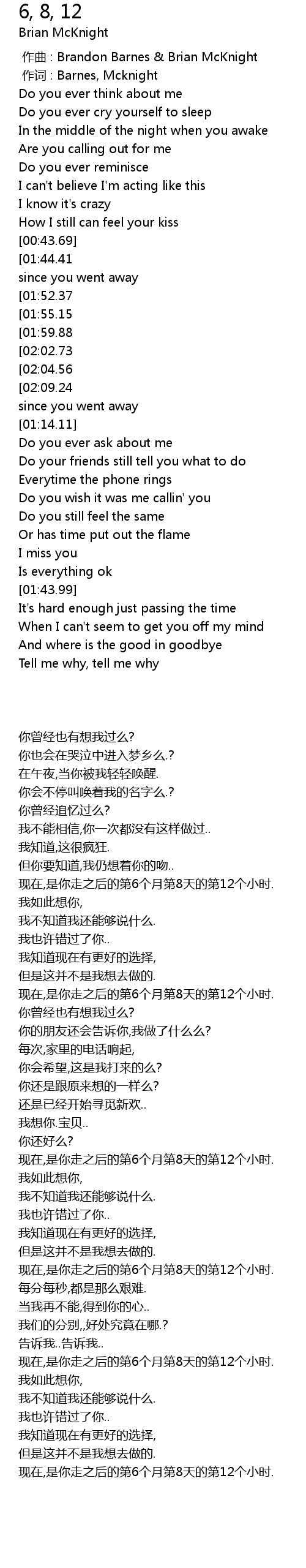 | [02:45.25][01:44.41][00:43.90] | It' s been six months, eight days, twelve hours since you went away |