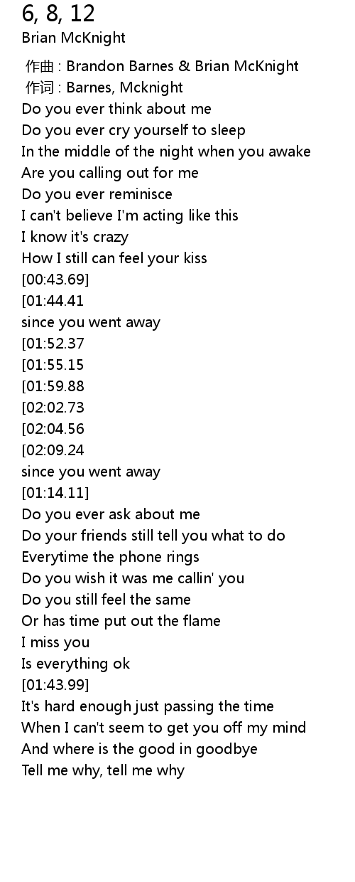| [02:45.25][01:44.41][00:43.90] | It' s been six months, eight days, twelve hours since you went away |