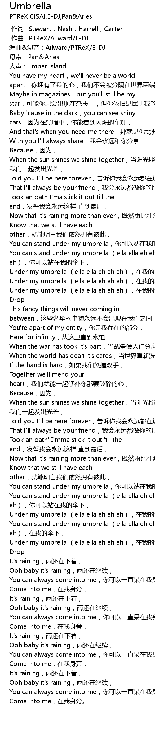 | [03:24.451] | You can stand under my umbrella ella ella eh eh eh, zài wǒ de sǎn xià, |