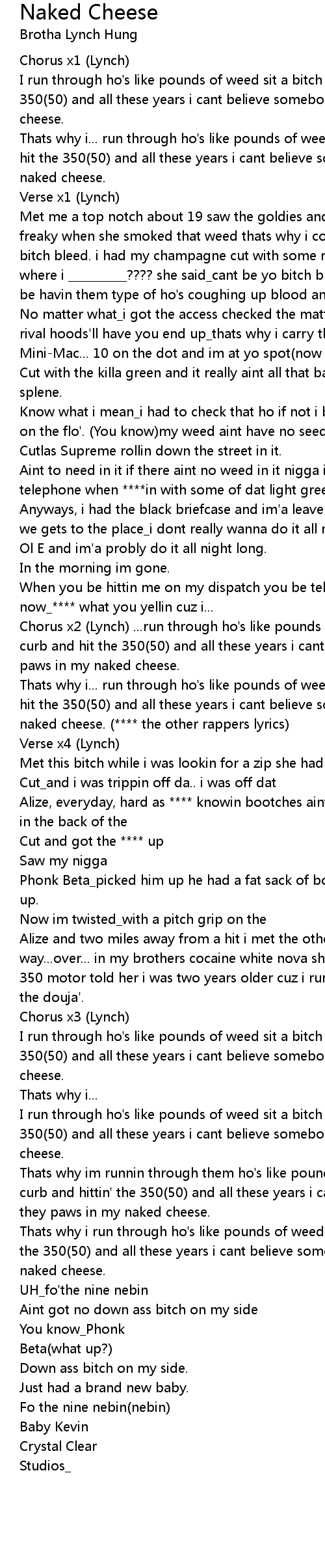 Chorus x2 (Lynch) ...run through ho's like pounds of weed sit a bitch on the curb and hit the 350(50) and all these years i cant believe somebody put they paws in my naked cheese. |