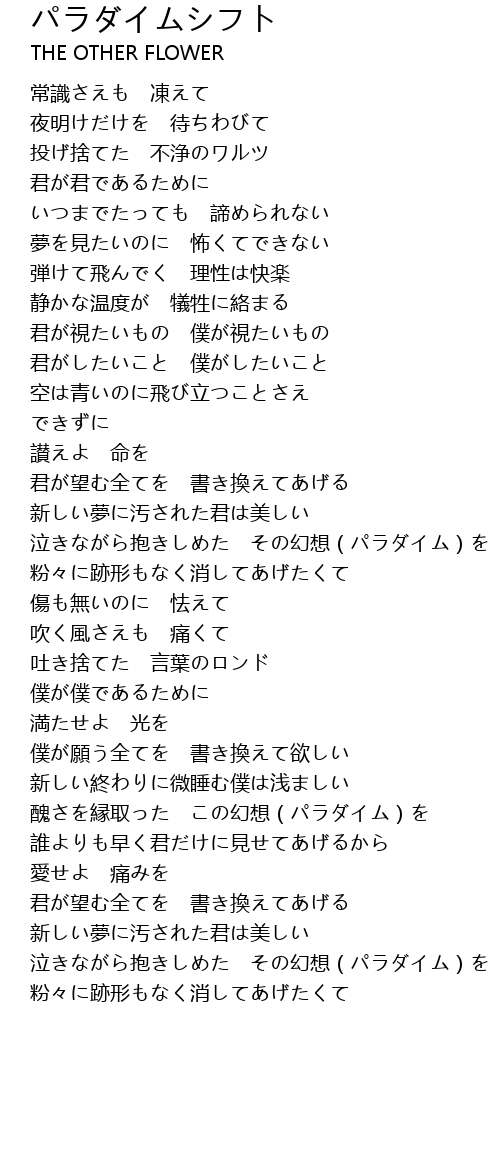 | [02:21.77] | 醜さを縁取った この幻想(パラダイム)を |