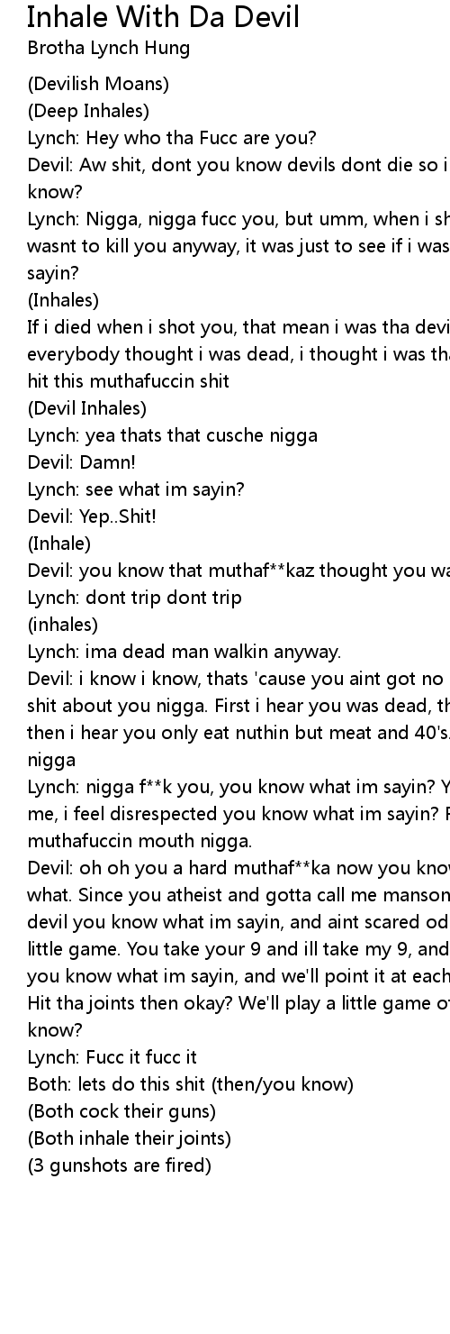 Devil: oh oh you a hard muthaf**ka now you know im sayin. well ill tell you what. Since you atheist and gotta call me manson 'cause you dont believe in tha devil you know what im sayin, and aint scared od dying and shit, lets play this little game. You take your 9 and ill take my 9, and we'll cock that shit back you know what im sayin, and we'll point it at each other you know what im sayin, Hit tha joints then okay? We'll play a little game of Russion Roulette then you know? |
