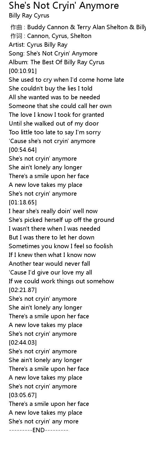 | [00:00.00] | 作曲 : Buddy Cannon & Terry Alan Shelton & Billy Ray Cyrus |