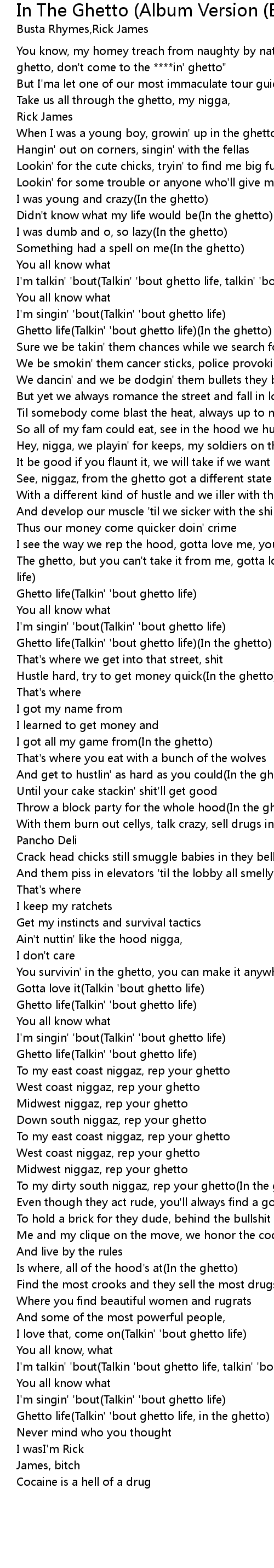 You know, my homey treach from naughty by nature once said"If you ain't from the ghetto, don't come to the ****in' ghetto" |