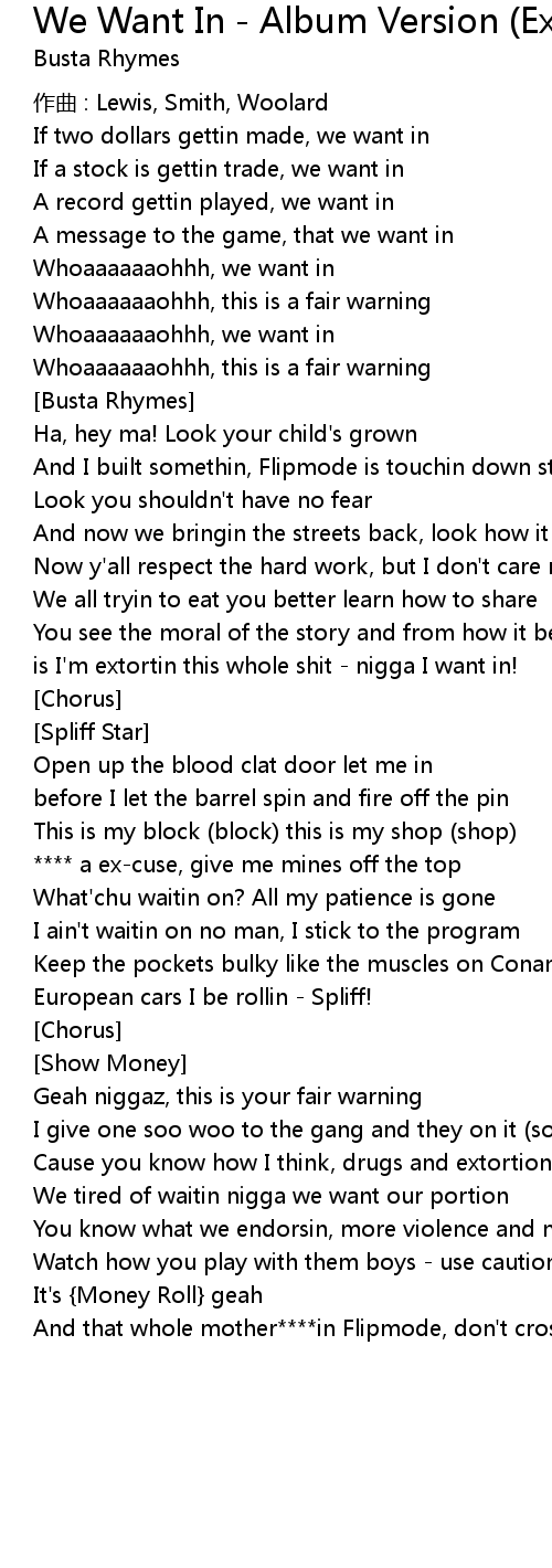 | Song | We Want In - Album Version (Explicit) |