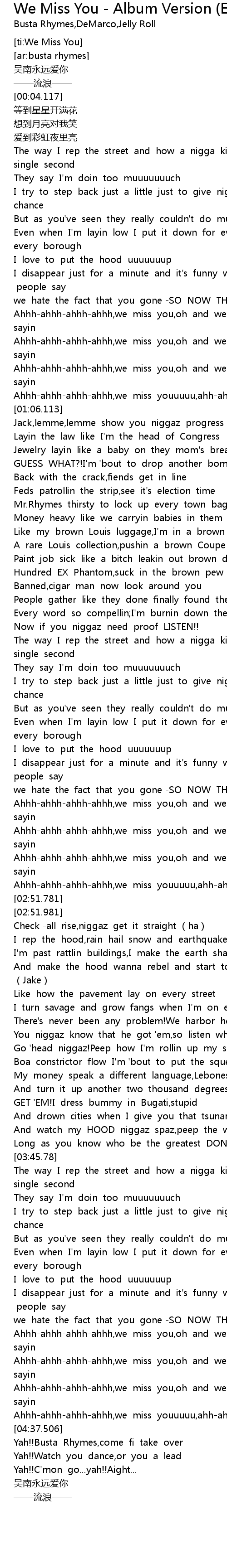 | [04:18.12] | Ahhhahhhahhhahhh, we miss you, oh and we love what you doin sayin |