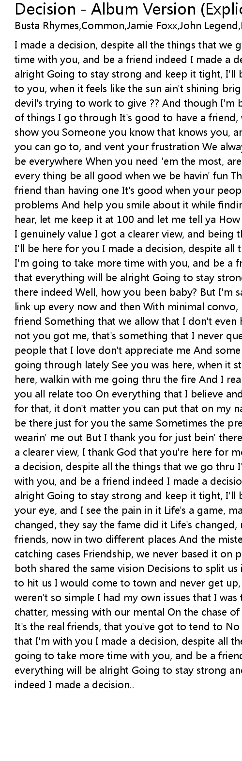 I made a decision, despite all the things that we go thru I'm going to take more time with you, and be a friend indeed I made a decision, that everything will be alright Going to stay strong and keep it tight, I'll be there indeed Let me talk to you, when it feels like the sun ain't shining bright enough It's like the devil's trying to work to give ?? And though I'm blessed, I still gotta handle of things I go through It's good to have a friend, with another perspective to show you Someone you know that knows you, and gives you motivation Someone that you can go to, and vent your frustration We always talk about our peeps, how we be everywhere When you need 'em the most, are they really ever there? See , every thing be all good when we be havin' fun The difference is really needing a friend than having one It's good when your peoples are there to help your problems And help you smile about it while finding a way to solve it Look at hear, let me keep it at 100 and let me tell ya How you hold me down is something I genuinely value I got a clearer view, and being that you're always here for me I'll be here for you I made a decision, despite all the things that we go thru I'm going to take more time with you, and be a friend indeed I made a decision, that everything will be alright Going to stay strong and keep it tight, I'll be there indeed Well, how you been baby? But I'm sayin' Even though we probably link up every now and then With minimal convo, look it's real good to see you friend Something that we allow that I don't even have to mention Is whether or not you got me, that's something that I never question Sometimes I feel that the people that I love don't appreciate me And some hate to see the shit I've been going through lately See you was here, when it started to haywire You're still here, walkin with me going thru the fire And I really love you for it, I know you all relate too On everything that I believe and I appreciate it you And just for that, it don't matter you can put that on my name The way you rep me, let me be there just for you the same Sometimes the pressure and the pain, it be wearin' me out But I thank you for just bein' there and for hearin' me out I got a clearer view, I thank God that you're here for me and I'm here for you I made a decision, despite all the things that we go thru I'm going to take more time with you, and be a friend indeed I made a decision, that everything will be alright Going to stay strong and keep it tight, I'll be there indeed I, look in your eye, and I see the pain in it Life's a game, maybe the game did it I know I changed, they say the fame did it Life's changed, maybe the game did it Two friends, now in two different places And the mister catchin' planes, and you catching cases Friendship, we never based it on position No matter the game, we both shared the same vision Decisions to split us in the place that life seemed to hit us I would come to town and never get up, with you Around then, things weren't so simple I had my own issues that I was trying to get through Outside chatter, messing with our mental On the chase of ?? trust, you can't forget to It's the real friends, that you've got to tend to No matter how far, just know that I'm with you I made a decision, despite all the things that we go thru I'm going to take more time with you, and be a friend indeed I made a decision, that everything will be alright Going to stay strong and keep it tight, I'll be there indeed I made a decision.. |