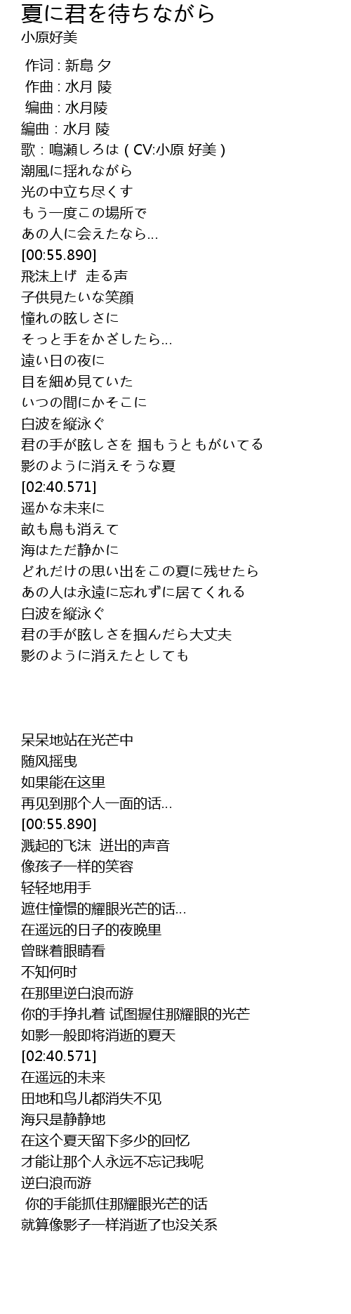 | [00:18.000] | 歌:鳴瀬しろは(CV:小原 好美) |