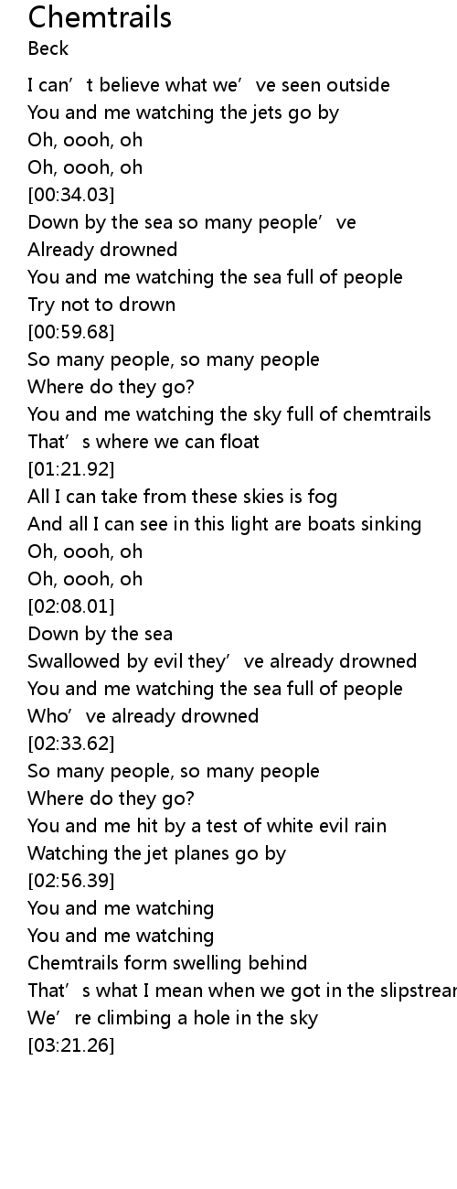 | [01:12.19] | You and me watching the sky full of chemtrails |