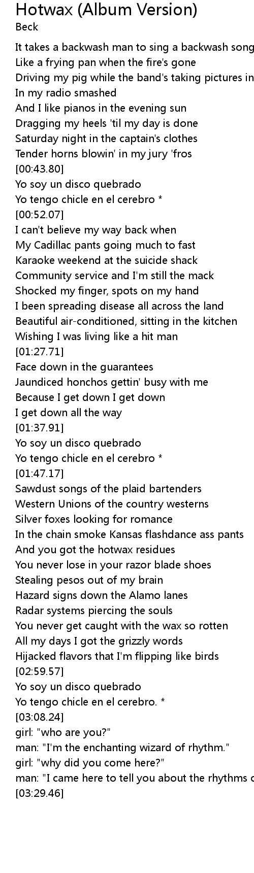 | [02:36.79] | In the chain smoke Kansas flashdance ass pants |