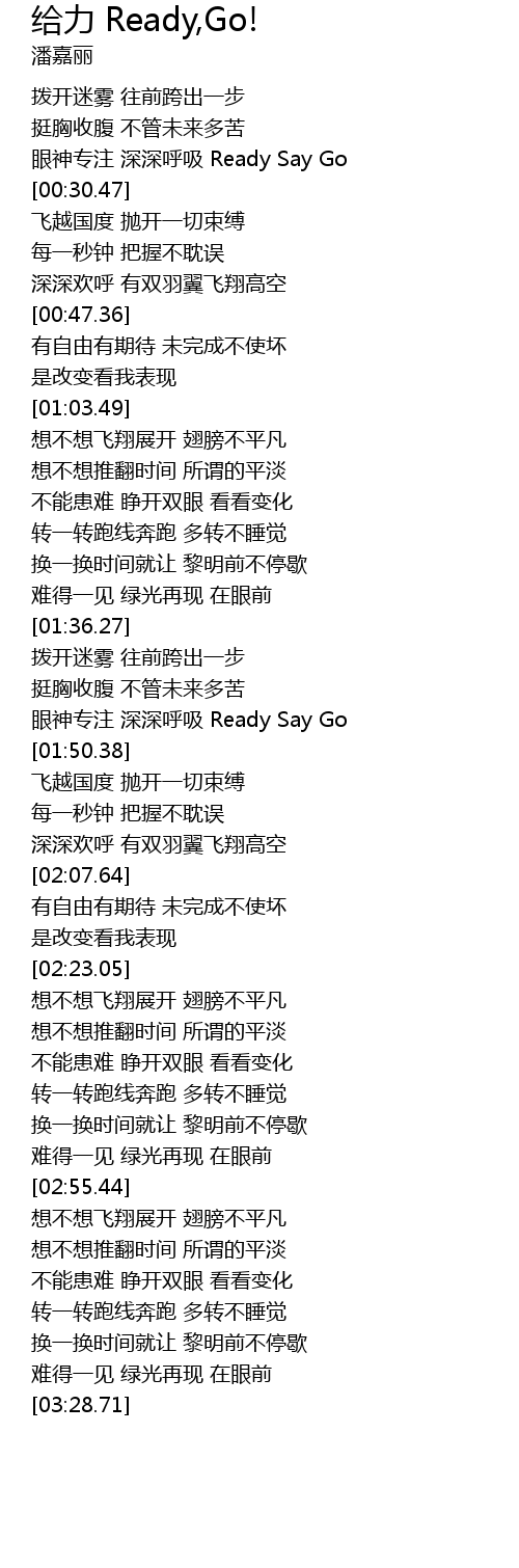| [00:25.32] | yǎn shén zhuān zhù shēn shēn hū xī Ready Say Go |