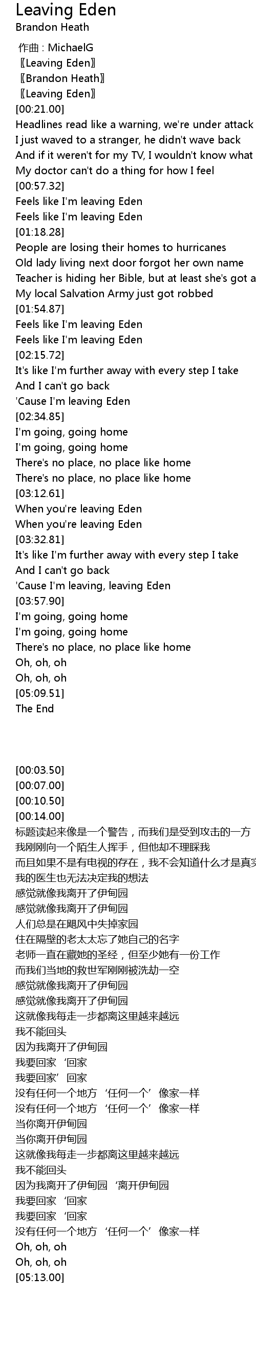| [00:59.84] | Feels like I'm leaving Eden |