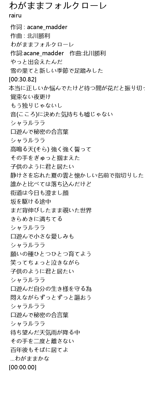 | [00:05.65] | 作詞:acane_madder 作曲:北川勝利 |