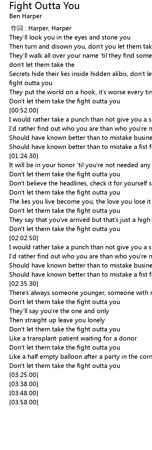 | [00:21.27] | Then turn and disown you, don't you let them take the fight outta you |