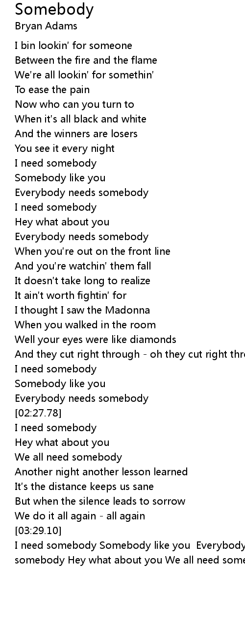 | [02:24.78] | Everybody needs somebody |
