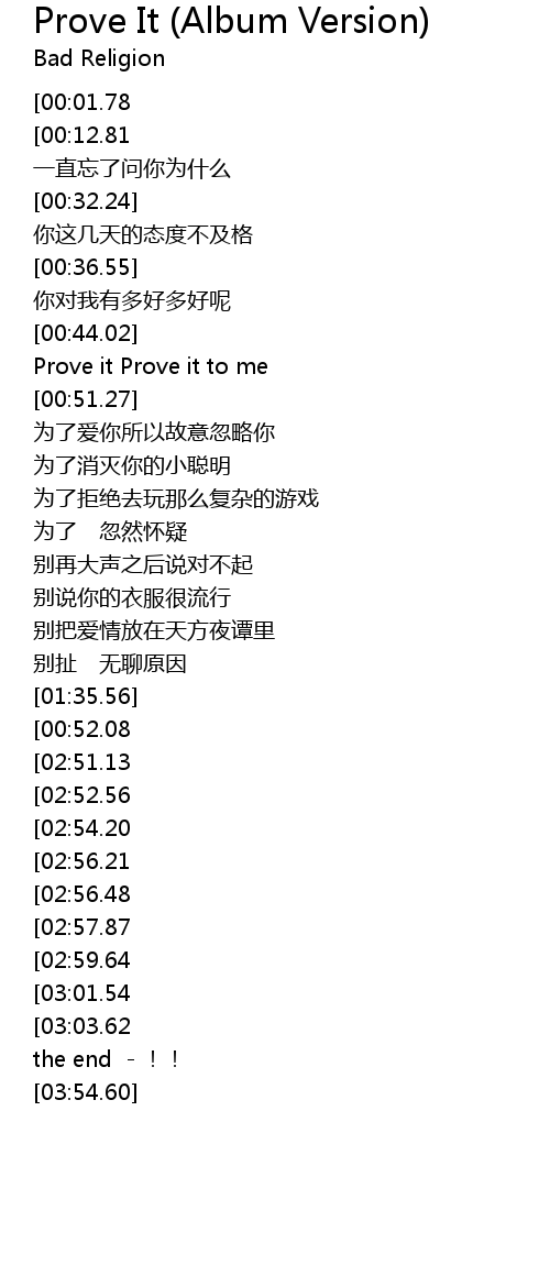 | [03:08.79][02:54.20][00:55.92] | Prove it Prove it to me |