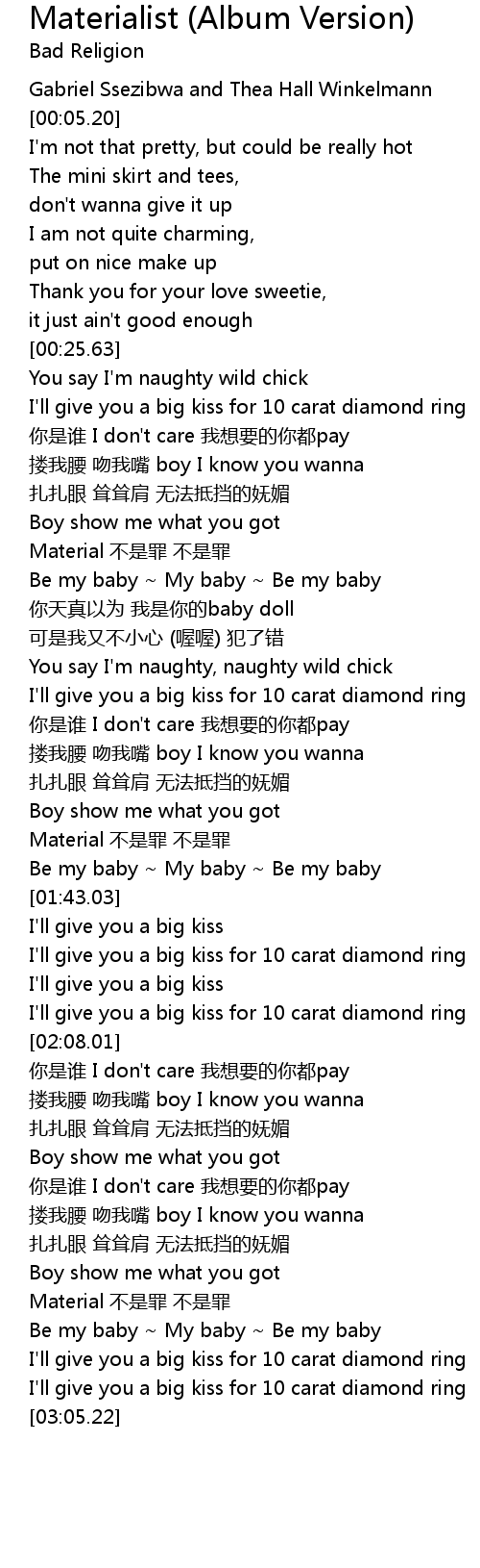 | [03:01.56] | I'll give you a big kiss for 10 carat diamond ring |