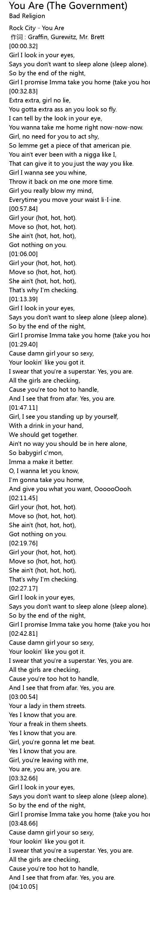 | [00:58.34] | Girl your (hot, hot, hot). |