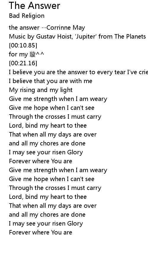 | [00:30.13] | I believe you are the answer to every tear I' ve cried |